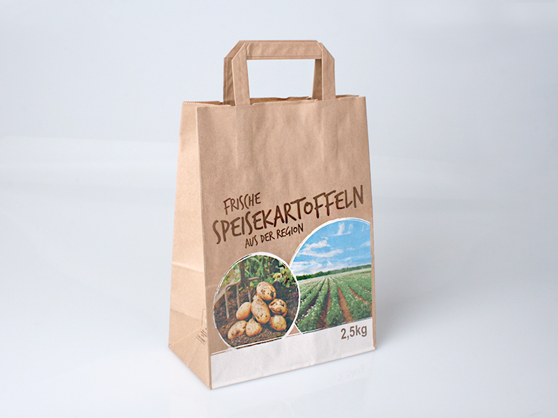 Der Klassiker unter den Papiertragetaschen, u. a. ideal für Hofladen und Wochenmarkt. Die robuste Ausführung mit flachen Papiergriffen bringt Ihre Kartoffeln ansprechend und nachhaltig zum Kunden.